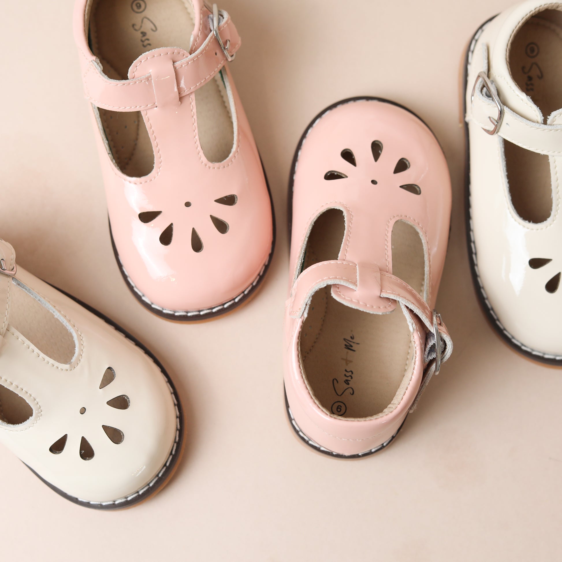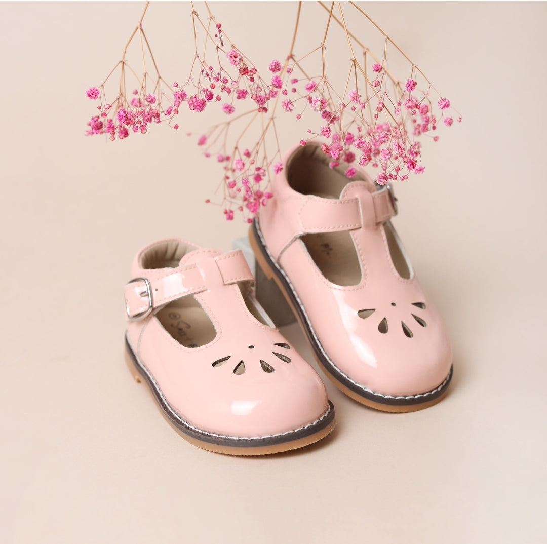 Beautiful handmade scallop T Bars in Rose patent leather, perfect for all seasons.