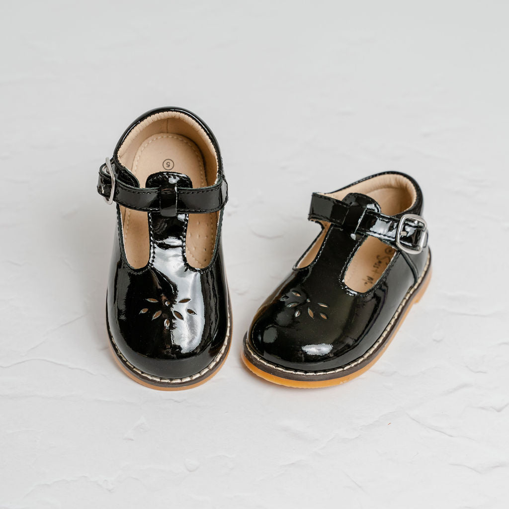 Beautiful handmade T Bars in black patent leather with a buckle strap